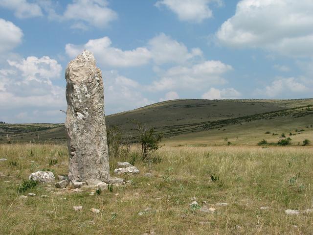 (La photographie est celle d’un menhir du Causse Méjean. La vision superposée de l’horizon et du menhir détermine une croix. Bien avant le christianisme le schéme de la croix associait ainsi les deux infinis, celui de la terre, horizontal, et celui du ciel, vertical. Précisément, dans la religion chrétienne, le christ, le crucifié, est celui qui participe des deux infinis. Par son humanité il participe de l’infini horizontal et terrestre; par sa divinité de l’infini céleste vertical. Mais il est troublant qu’un menhir, aussi bien avec le sol qu’avec l’horizon, fasse ainsi un « signe de croix ».)