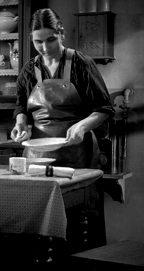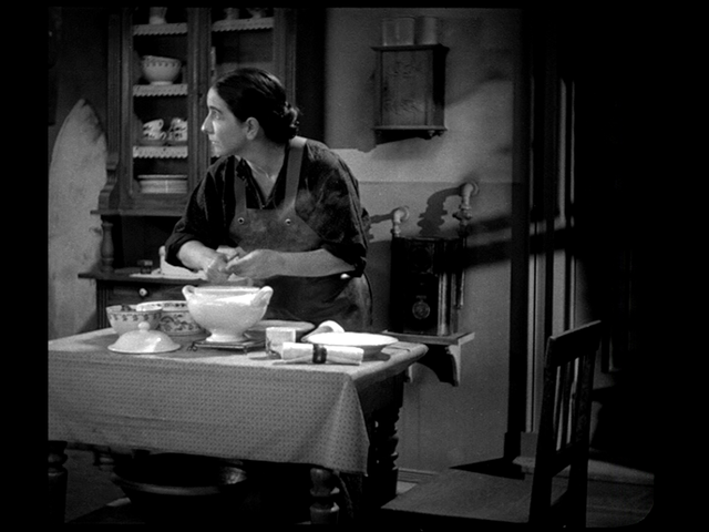 Mais, et ne serait-ce que parce que Lang a habillé la maman d’Elsie d’un tablier étrange et quelque peu inquiétant, nous pouvons soupçonner que cela ne constitue pas la vérité de la situation. En réalité elle porte le tablier en caoutchouc des blanchisseuses à domicile. Elle garde ce tablier pendant qu’elle met la table pour Elsie.