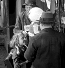 Personne ne voit rien. L’aveugle, au fond – on aperçoit le début du mot allemand Blind qui signifie aveugle, ne voit rien. La fillette va vers M sans voir qu’il s’agit peut-être du méchant homme noir de la comptine. Hans Beckert ne voit pas qu’il est en train de devenir à nouveau M. L’aveugle, cependant, identifiera M en reconnaissant l’air que celui-ci sifflote quand il est en chasse.