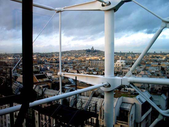 Toute construction émergée, sauf exception, donne à voir immédiatement l’entourage et, avec celui-ci, toujours une partie d’elle-même. L’édifice se compose ainsi avec le paysage. Fenêtres, baies, portes, transparences crééent des vues tout en se laissant voir elles-mêmes. Ici nous voyons autant les toits parisiens avec, dans le lointain, le Sacré-Coeur que la structure métallique qui soutient les grands plateaux libres du Centre Georges Pompidou. (Architectes Richard Rogers et Renzo Piano). Cette logique s’apparente à celle de la Tour Eiffel qui déploie dans le paysage qu’elle révèle les variations de ses poutres métalliques.