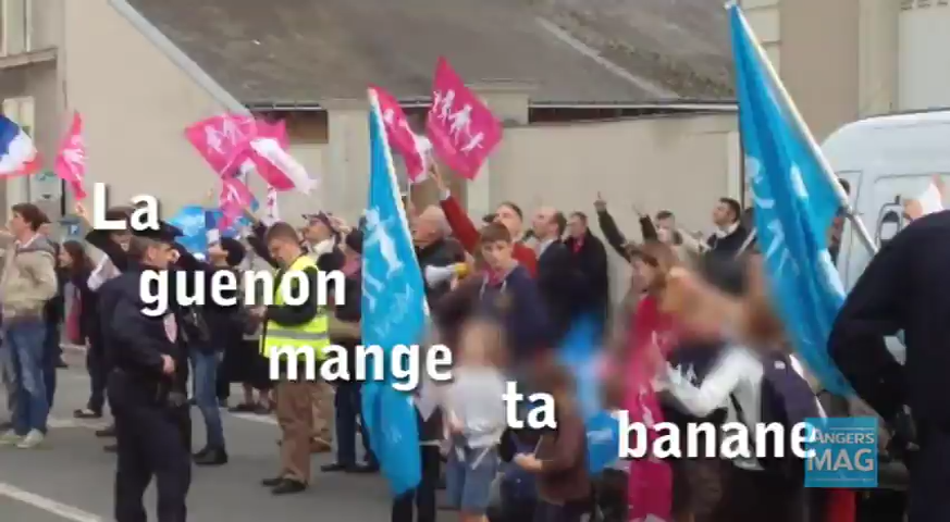 Dans un premier temps des enfants crient en choeur à l’intention de la ministre Christiane Taubira : La guenon mange ta banane!