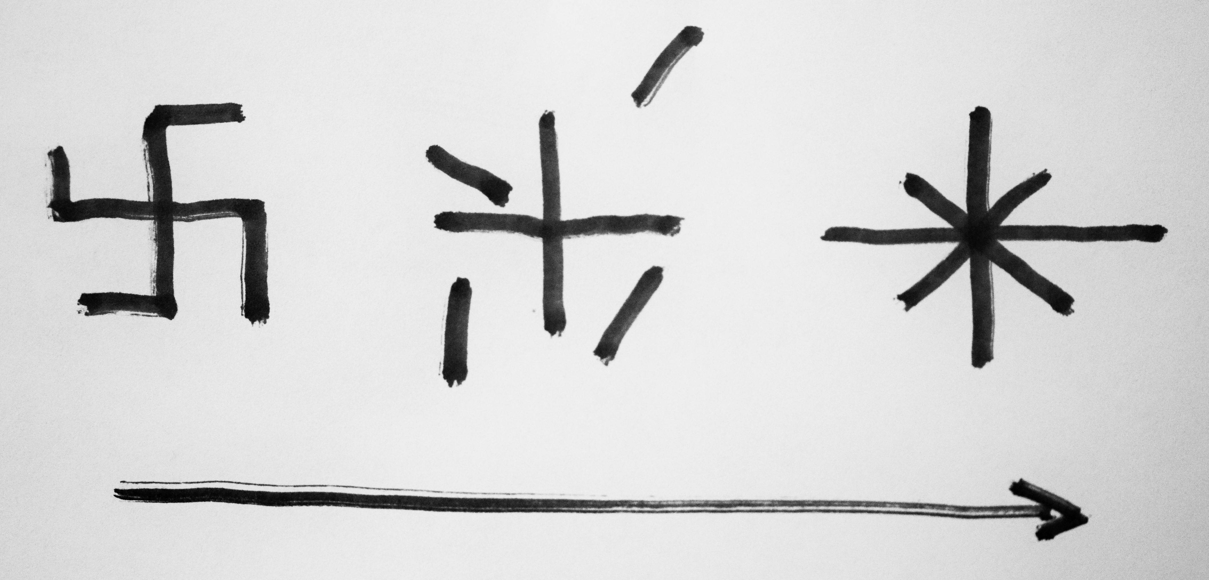 On prend donc la croix gammée nazie, on disloque les branches d’extrémités puis, avec elles, on reconstitue l’étoile.