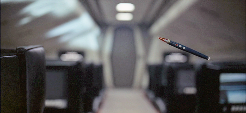 On connaît la déclinaison kubrickienne qui associe ces trois images : celle de l’os-massue ; celle de l’astronef ; celle du stylo de Floyd Heywood. Ce dernier est un bureaucrate de l’espace capable de commettre effectivement des « crimes de bureau ». C’est menaçant, bien que restant dans la forme de la cordialité, qu’il s’adresse par exemple à son auditoire en vue de lui imposer le silence absolu quant à l’existence d’une épidémie dans le système.