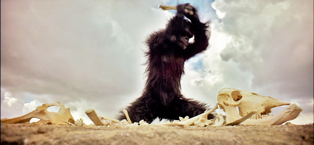 Le film de Kubrick serait heideggériennement un poème visuel destiné à « faire apparaître ce qui sauve ». Mais, précisément, la mise en image de Kubrick est inséparable de la mise en évidence de l’étroite association entre l’agressivité et la technique. Est-ce une vérité anthropologique ? Avant même l’invention de la taille et du polissage, par exemple du silex, on peut admettre avec Kubrick la possibilité que des pré-humains aient inventé la massue simplement en « recyclant » certains os prélevés sur des carcasses de grands animaux morts.