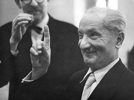 Heidegger s’en tient à son léger sourire. Il peut être comblé. Il est célébré dans le monde entier. Et à travers lui ce cher Adolf. La moustache hitlérienne est en effet toujours en place quoiqu’à l’abri dans une moustache plus grande et plus spacieuse. C’est le symbole parfait de la duplicité de Heidegger. « Le langage est l’abri de l’être » disait-il. Juste au-dessus de la bouche parlante la moustache heideggérienne veille sur la moustache hitlérienne. Le langage d’Hitler a mis à l’abri l’être allemand en l’arrachant de la griffe du « juif » ; celui de Heidegger, également corporel, met à l’abri l’être hitlérien. Voilà comment on écrase un peuple tenté un moment par l’universel !