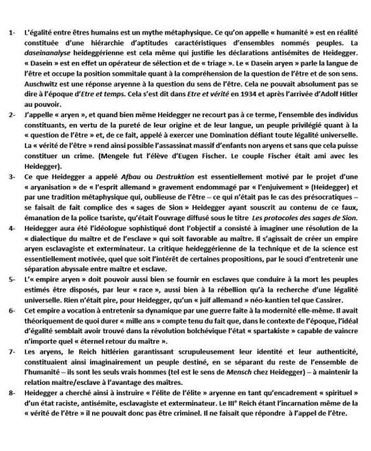- J’appelle « aryen », et quand bien même Heidegger ne recourt pas à ce terme, l’ensemble des individus constituants, en vertu de la pureté de leur origine et de leur langue, un peuple privilégié quant à la « question de l’être » et, de ce fait, appelé à exercer une Domination défiant toute légalité universelle. La « vérité de l’être » rend ainsi possible l’assassinat massif d’enfants non aryens et sans que cela puisse constituer un crime. (Mengele fut l’élève d’Eugen Fischer. Le couple Fischer était ami avec les Heidegger).