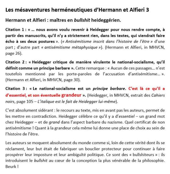 Les mésaventures herméneutiques d’Hermann et Alfieri 3. C’est absolument sidérant : le recours au texte, mis en avant pas les auteurs, permet de les mettre en contradiction. Heidegger célèbre ce qu’il y a d’essentiel – un grand mot chez Heidegger – et de grand dans l’aspect barbare du nazisme. Hermann et Alfieri : maîtres en ‘bullshit’ heideggérien.