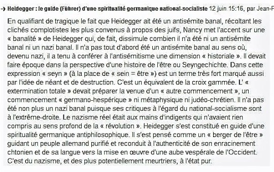 Sur Akadem J-L Nancy qualifie Heidegger d’antisémite banal. Cela revient à nier que Heidegger n’a jamais cessé d’être un nazi « à la droite de Hitler ». Réponse >