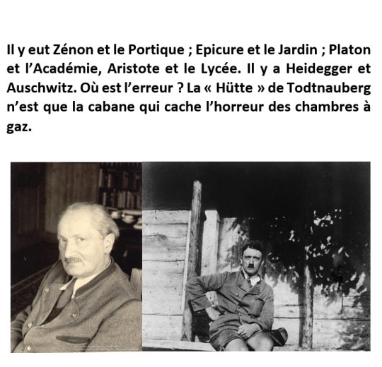 Ce qui est sans doute le plus terrifiant dans ce diptyque c’est que le portrait de Heidegger est une photographie d’après-guerre. Voilà tout Heidegger : il a dissimulé ses anciennes moustaches hitlériennes dans des moustaches plus amples et beaucoup moins connotées. Il n’a jamais cessé, même au-delà de la mort (avec l’entretien publié a titre posthume, et cela était prévu depuis des années, au Spiegel), à semer tout au long de sa vie et de son œuvre les petits cailloux de son identification à la vision du monde nazie et cela dans sa conception la plus meurtrière.