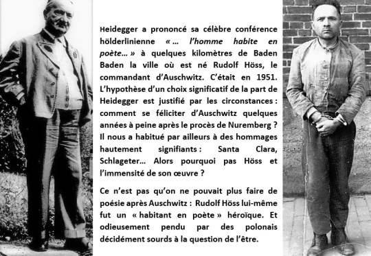 En prononçant sa conférence « …l’homme habite en poète… » prés de Baden Baden Heidegger invitait, pour lui rendre hommage, le spectre du commandant d’Auschwitz : Rudolf Höss.