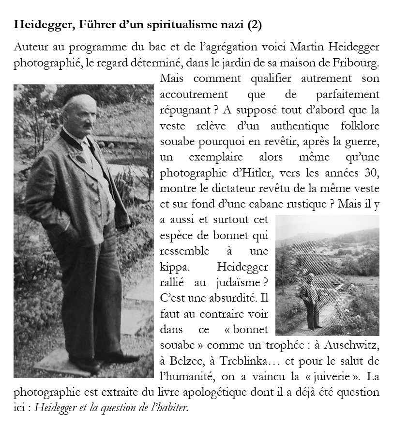 Pour l'essentiel ce blog est consacré à l'étude critique des rapports étroits que le philosophe Martin Heidegger a entretenu avec le nazisme. Heidegger et Hitler "sont la même chose".