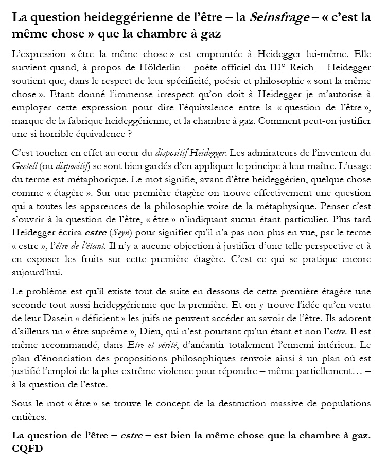 Pour l'essentiel ce blog est consacré à l'étude critique des rapports étroits que le philosophe Martin Heidegger a entretenu avec le nazisme. Heidegger et Hitler "sont la même chose".