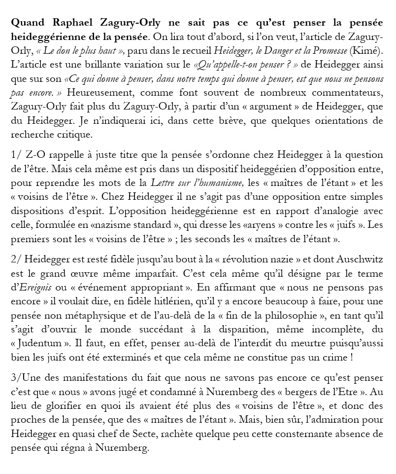 Quand Raphael Zagury-Orly ne sait pas ce qu’est penser la pensée heideggérienne de la pensée.